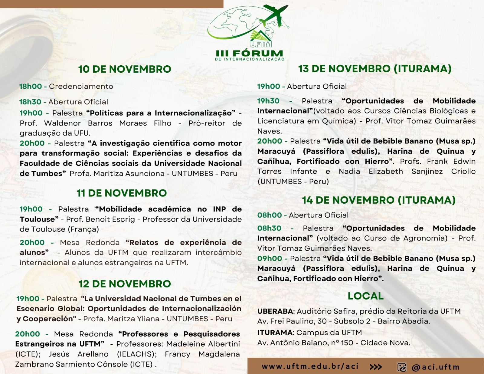 Entre os dias 10 e 14 de novembro acontece nos campi Uberaba e Iturama o III Fórum de Internacionalização da UFTM. A Assessoria de Cooperação Internacional (ACI) convida a...