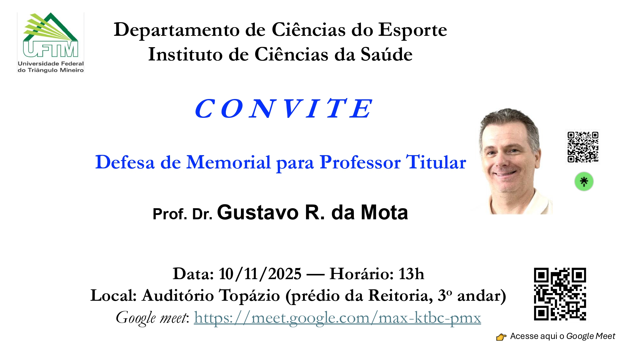 O Departamento de Ciências do Esporte da Universidade Federal do Triângulo Mineiro (UFTM) convida  a comunidade acadêmica e interessados para a defesa pública do Memorial da...