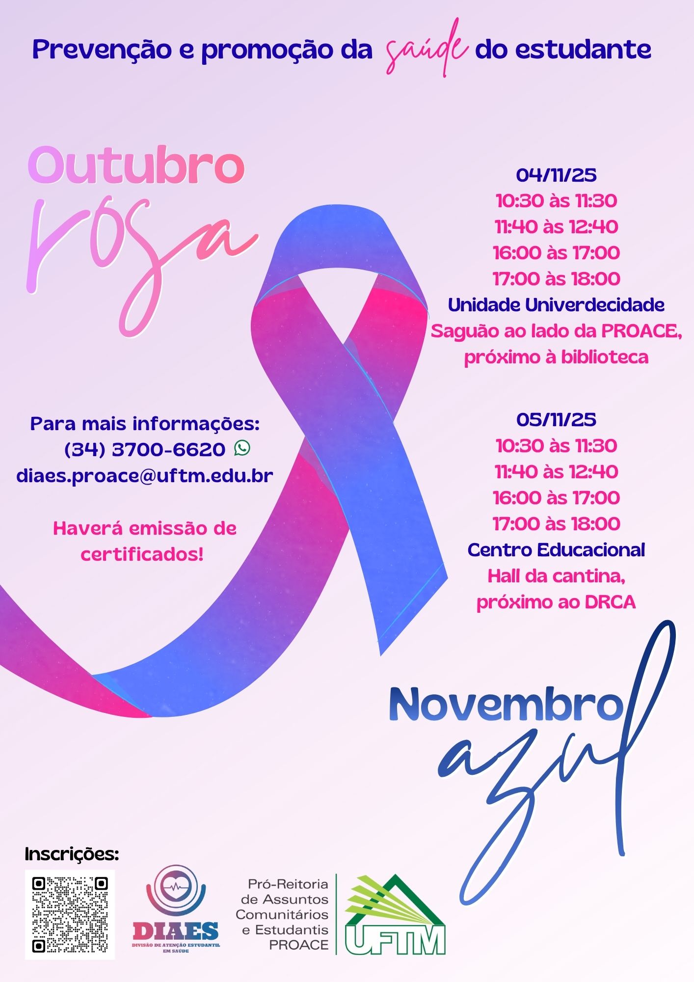 Com o tema “Outubro Rosa e Novembro Azul: prevenção e promoção da saúde do estudante”, a Divisão de Atenção Estudantil em Saúde (DIAES) realizará nos dias 4 e 5 de novembro,...