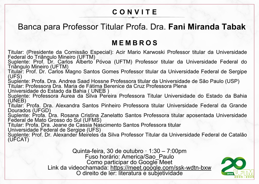 No dia 30 de outubro, das 13h30 às 19h, acontecerá a banca de promoção à Classe E de Professor Titular da Carreira do Magistério Superior da docente Fani Miranda Tabak. A...