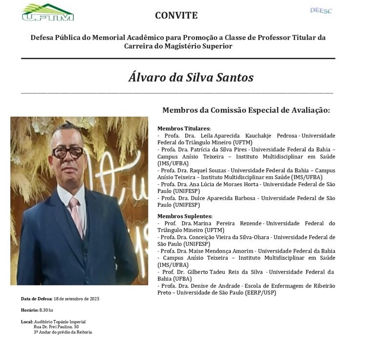 O Departamento Didático-Científico de Enfermagem em Educação e Saúde Comunitária (DEESC) da Universidade Federal do Triângulo Mineiro convida convida a comunidade acadêmica e...