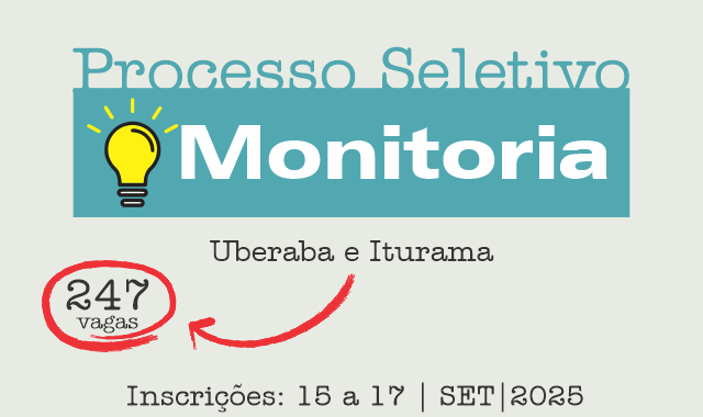De 15 a 17 de setembro estarão abertas as inscrições do Processo Seletivo para Monitoria dos cursos de Graduação 2025/02 no Campus Uberaba e Iturama. A seleção inclui 247...