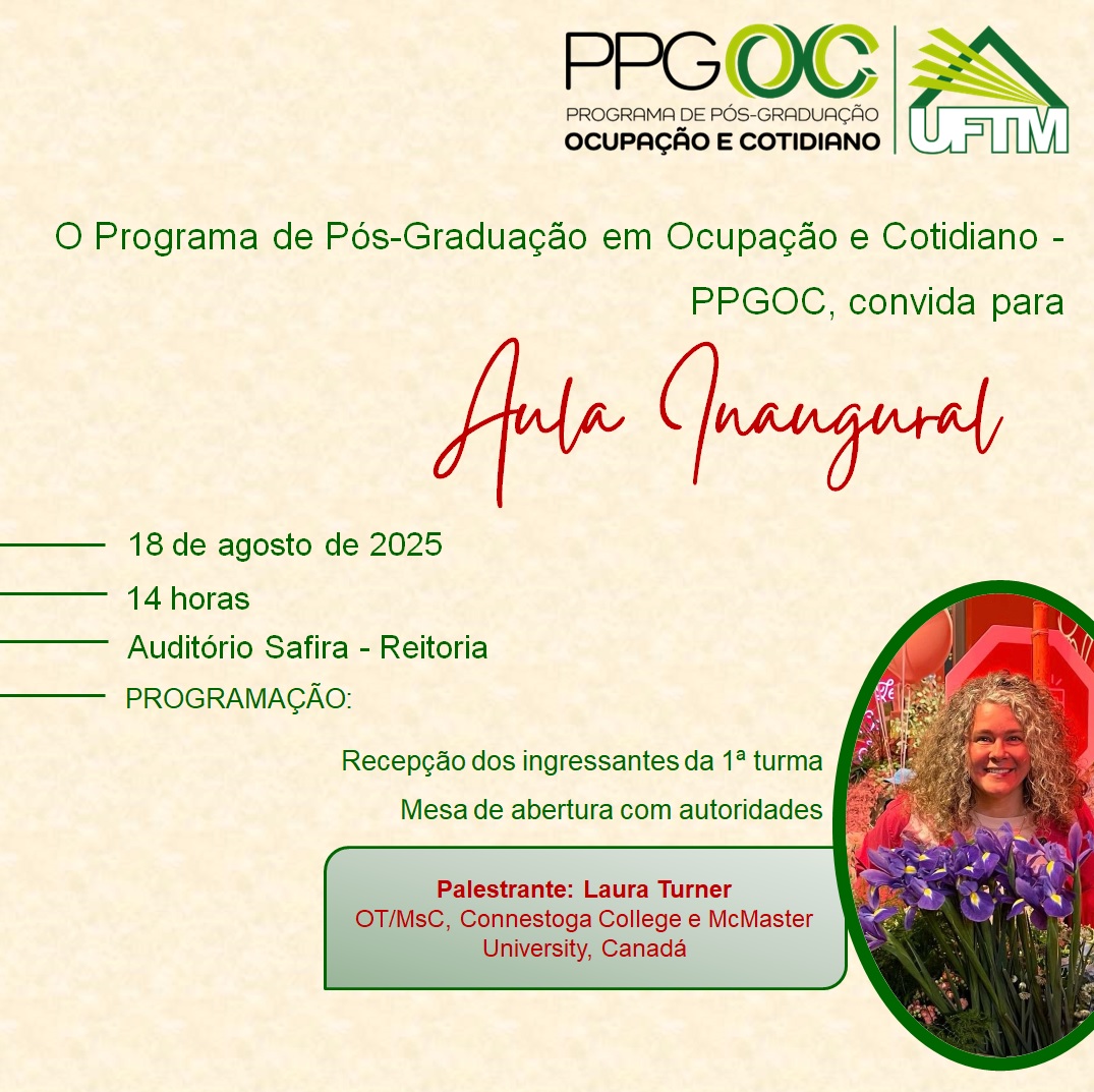 O Programa de Pós-Graduação em Ocupação e Cotidiano da UFTM receberá a Terapeuta Ocupacional Laura Turner (Canadá) para uma palestra no dia 18 de agosto, às 14h, no...