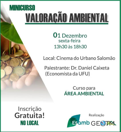 As empresas juniores Esamb (Engenharia Ambiental) e GEOTM (Geografia) da UFTM realizam o primeiro curso de Valoração Ambiental hoje, dia 1º de dezembro, a partir das 13h30, no cinema...