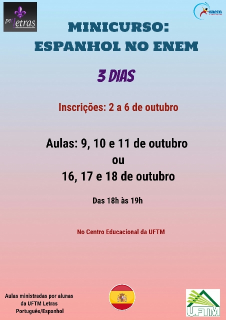 O PET Letras da UFTM abriu inscrições de hoje a dia 6 de outubro para o Minicurso: Espanhol no ENEM. O público-alvo são estudantes que irão prestar o exame em 2017. As aulas são...