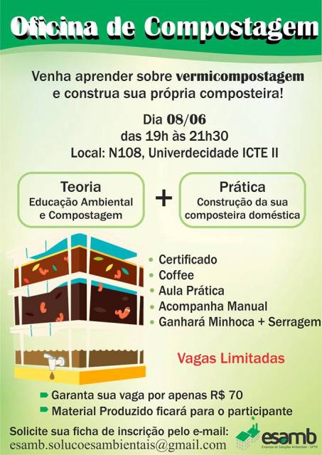 A Empresa Júnior de Soluções Ambientais do curso de Engenharia Ambiental da UFTM, Esamb, oferece um curso de compostagem doméstica para a comunidade de Uberaba no dia 8 de junho a...