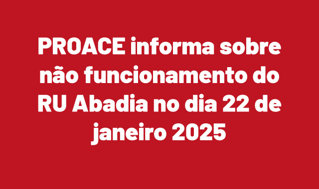 A PROACE informa que hoje, dia 22 de janeiro, o Restaurante Universitário da Unidade Abadia não irá funcionar para o jantar em decorrência da falta de água no prédio e consequente...