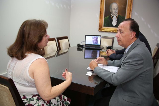 Franz Brandenberger, adido de cooperação internacional do consulado do Canadá em Belo Horizonte, visitou a UFTM hoje de manhã com o objetivo de estreitar os laços do governo canadense com instituições de ensino do Brasil. Ele se reuniu no Prédio da Reitoria com a reitora Ana Lúcia de Assis Simões e com o professor Wendell Meira, coordenador da Assessoria de Cooperação Internacional - ACI, encontro que foi acompanhado por videoconferência pelo coordenador do curso de Agronomia em Iturama, professor Helder Barbosa Paulino.
