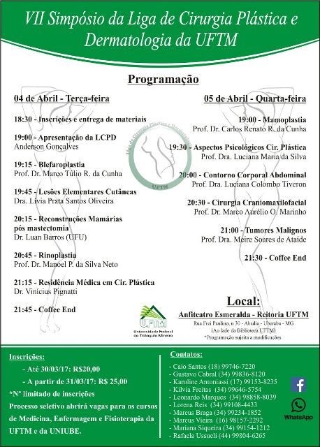 A Liga de Cirurgia Plástica e Dermatologia da UFTM - LCPD abriu inscrições à comunidade interna e externa da Universidade para o seu 7º Simpósio, que será realizado nos dias 4 e 5 de abril no Auditório Esmeralda, no prédio da Reitoria. O evento tem como objetivo trazer informações atualizadas a respeito das áreas de cirurgia plástica e de dermatologia por meio de médicos, residentes e especialistas nas áreas. Também visa servir de referência para o processo seletivo de ingresso à LCPD que abrirá vagas para acadêmicos do curso de Medicina, Fisioterapia e Enfermagem da UFTM. Além disso, serão disponibilizadas vagas para acadêmicos da Uniube acompanharem as aulas teórico-expositivas.