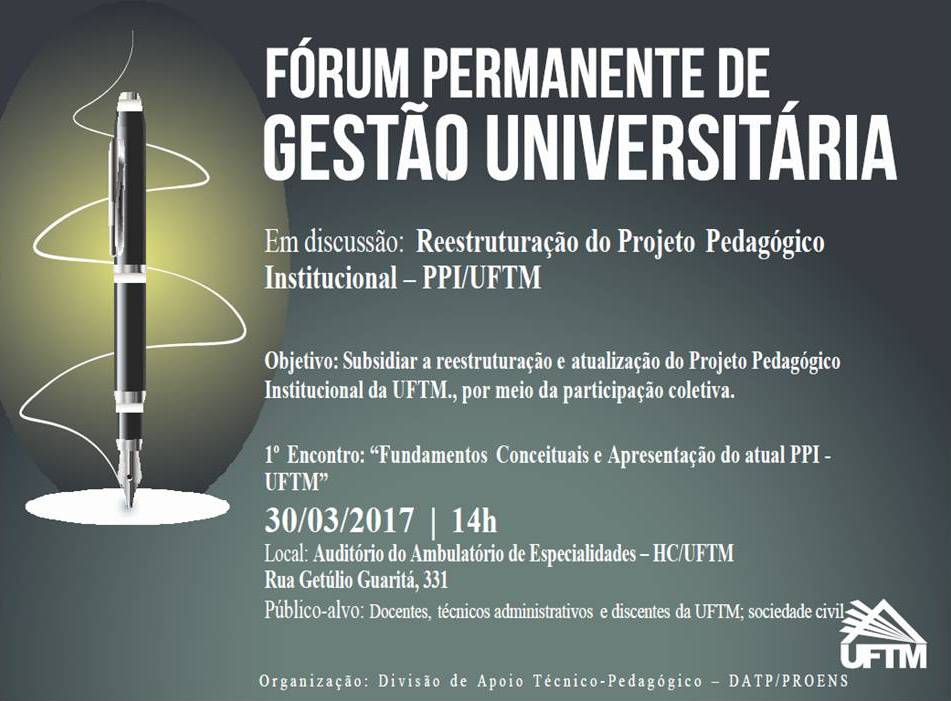 O Fórum Permanente de Gestão Universitária é coordenado pela Divisão de Apoio Técnico-Pedagógico – DATP, unidade da Pró-Reitoria de Ensino. É realizado desde 2011, e tem como objetivo oferecer espaços formativos para atualização, aprimoramento, inovação e profissionalização em gestão de cursos de graduação na UFTM. Segundo a DATP, será emitido certificado aos participantes.