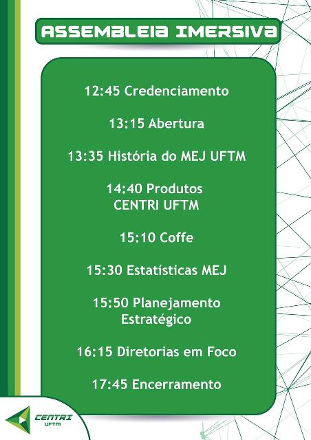 O Centri UFTM, Núcleo de Empresas Juniores da UFTM, realiza uma assembleia imersiva neste sábado, dia 1º de abril, a partir das 12h45, no auditório Rubi, na Unidade III da UFTM, na Univerdecidade. De acordo com os organizadores, o objetivo é fomentar o Movimento Empresa Júnior na Universidade Federal do Triângulo Mineiro, unificando, alinhando e desenvolvendo as Empresas Juniores para formar uma instituição cada vez mais empreendedora.