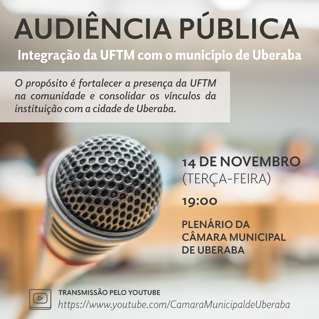 No dia 14 de novembro, às 19:00, no plenário da câmara municipal de Uberaba acontecerá a audiência pública, Integração da UFTM com o município de Uberaba, que foi proposta pela vereadora Rochelle Gutierrez.