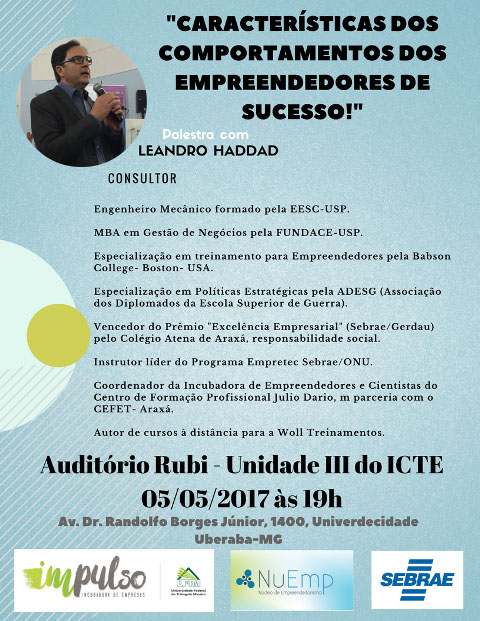 As atividades de 2017 da Incubadora Impulso da UFTM iniciarão com a palestra "Características dos comportamentos dos empreendedores de sucesso", ministrada pelo consultor Leandro Haddad, indicado pelo Sebrae MG. O evento é organizado pelo Núcleo de Empreendedorismo da UFTM e será realizado para recepcionar as Startups que foram aprovadas nos editais do 1° semestre de Incubação e Pré-incubação. A recepção acontecerá no auditório Rubi, localizado na Unidade III da UFTM na Univerdecidade, hoje, dia 5 de maio, a partir das 19 horas. O evento é aberto a toda comunidade acadêmica.