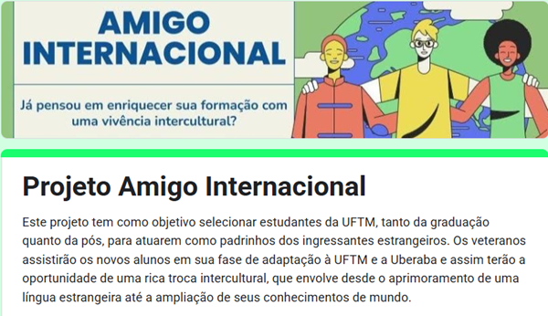 Imagine chegar a um país diferente, com uma língua, cultura e costumes novos, para estudar em uma universidade desconhecida. É um desafio emocionante, mas que pode ser mais leve com a ajuda de quem já conhece o caminho. Pensando nisso, a Assessoria de Cooperação Internacional da UFTM criou o Projeto Amigo Internacional, e você pode fazer parte dessa experiência transformadora!