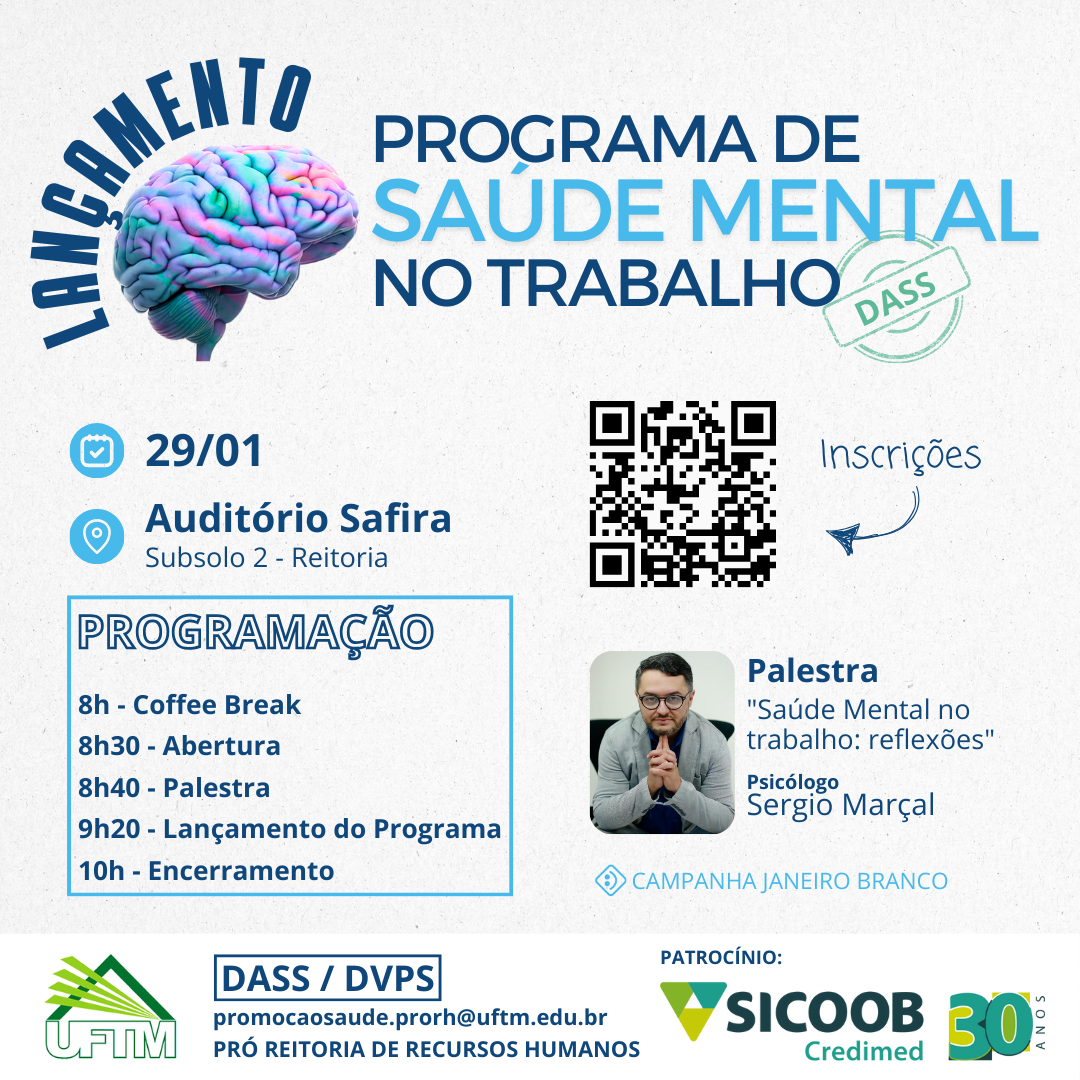 O Departamento de Atenção à Saúde do Servidor (DASS), por meio da Divisão de Vigilância e Promoção à Saúde (DVPS), convida os servidores para o lançamento do Programa de Saúde Mental no Trabalho.
