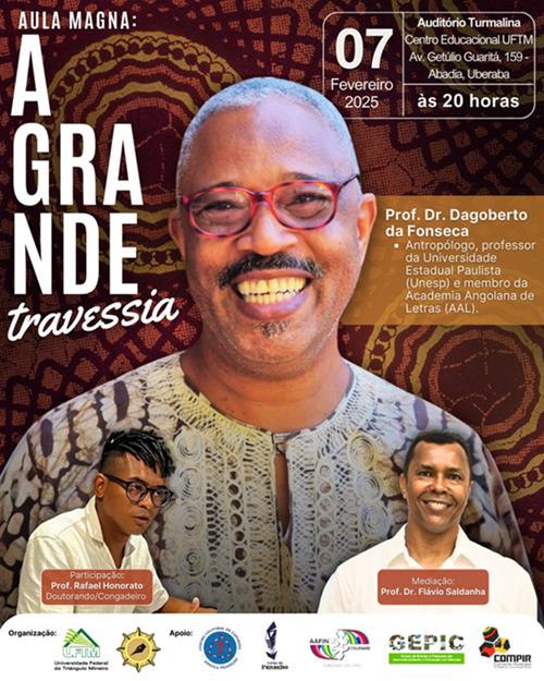 A Universidade Federal do Triângulo Mineiro — UFTM vai sediar, no próximo dia 7 de fevereiro de 2025, a "Aula Magna: A Grande Travessia". O evento, desenvolvido em parceria com a Academia Angolana de Letras - AAL, será ministrado pelo Dr. Dagoberto José Fonseca, Professor Associado da UNESP, Coordenador do Projeto e do Grupo Gestor. A apresentação está marcada para as 20h, no Auditório Turmalina - Centro Educacional da UFTM, situado na rua Getúlio Guaritá, núm. 159, no bairro Abadia - Uberaba/MG.