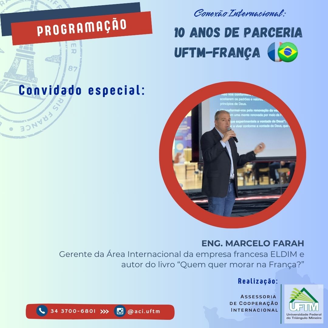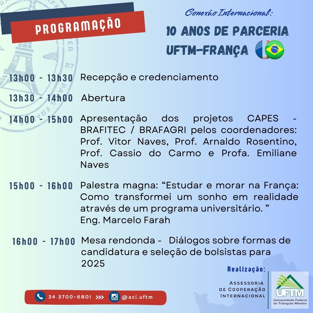 A Assessoria de Cooperação Internacional e Coordenadores do Brasil France Ingénieur Technologie (Brafitec) e do Programa Brasil França Agricultura (Brafagri) anunciam o evento "Workshop Brafitc/Brafagari - Conexão Internacional: 10 anos de parceria UFTM — França, a ser realizado no dia 13.2.2025, com início às 13h e término às 17h, no Auditório Rubi — Unidade III da UFTM, Avenida Doutor Randolfo Borges Júnior, 1400, Univerdecidade.