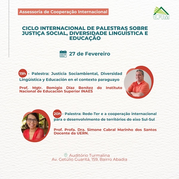 A Assessoria de Cooperação Internacional da Universidade Federal do Triângulo Mineiro (UFTM) promoverá, nos dias 26 e 27 de fevereiro, o Ciclo Internacional de Palestras sobre Justiça Socioambiental e Educação. O evento contará com a participação de renomados professores internacionais: Geraldine Chadwick, professora da Universidade de Buenos Aires (UBA), e Remigio Díaz Benítez, professor do Instituto Nacional de Educação Superior (INAES) do Paraguai. Além disso, a Profa. Dra. Simone Cabral Marinho dos Santos, presidente da REDE-TER e docente da Universidade do Estado do Rio Grande do Norte (UERN), também estará entre os palestrantes convidados.