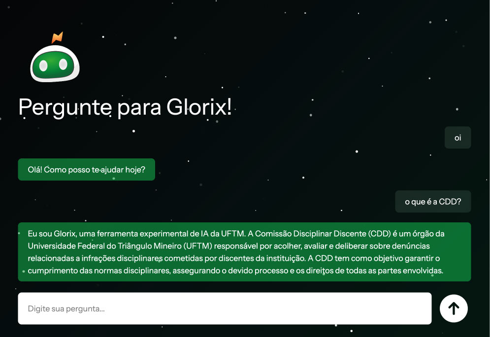 No intuito de ampliar o acesso às informações sobre os procedimentos da Comissão Disciplinar Discente (CDD) e facilitar a compreensão das normas institucionais, a UFTM está implementando Glorix, uma ferramenta experimental de inteligência artificial desenvolvida para interagir de forma didática e objetiva com a comunidade acadêmica.