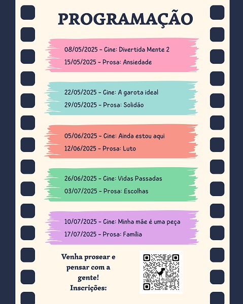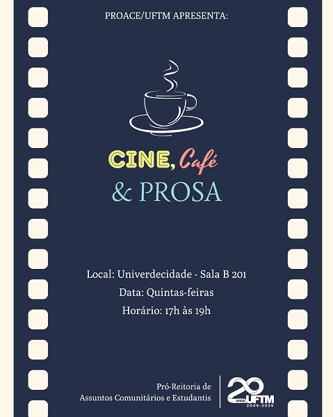 O Projeto Cine, Café & Prosa está com inscrições abertas para a comunidade acadêmica da UFTM. Coordenado pela psicóloga Carolina Martins Pereira Alves e pela nutricionista Jacqueline Ap. Assis Silva, da Pró-reitoria de Assuntos Comunitários e Estudantis (PROACE), o projeto engloba um grupo aberto com objetivo de promover um espaço de diálogo, reflexões, socialização e lazer, a partir do uso de filmes e documentários sobre temas diversos, pertinentes à saúde e à qualidade de vida no contexto universitário.