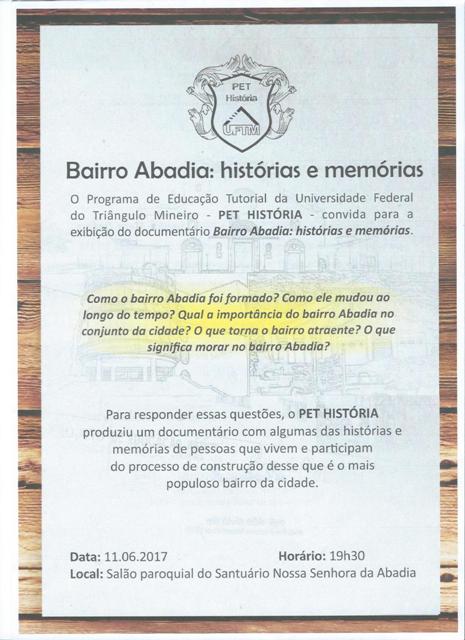 O documentário “Bairro Abadia: histórias e memórias” será oficialmente lançado no próximo domingo, dia 11 de junho, no salão do Santuário Abadia, pelo PET História da UFTM. Na ocasião, também serão distribuídos para instituições e membros da comunidade exemplares do livro “Baú de Memórias. Entre a identidade e a diversidade no bairro Abadia. (Uberaba-MG)”, igualmente produzido pelo grupo do Programa de Educação Tutorial.
