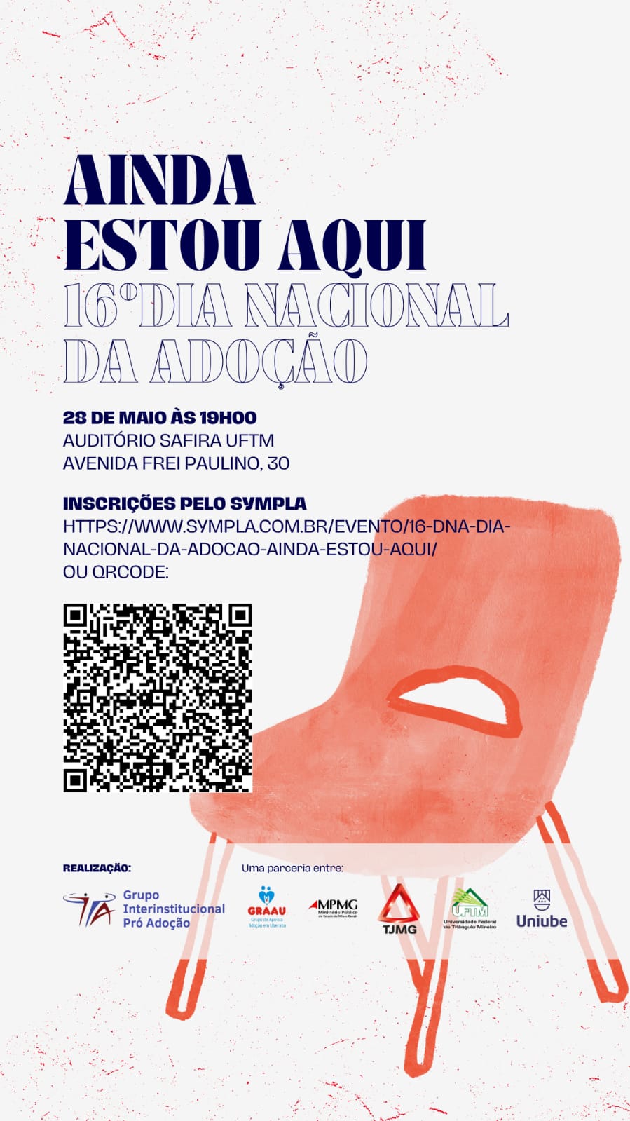 Nosso encontro acontecerá no dia 28 de maio (quarta-feira), às 19 horas, no Auditório Safira, localizado no Prédio da Reitoria da Universidade Federal do Triângulo Mineiro - UFTM, na Rua Frei Paulino, nº 30 — Nossa Senhora da Abadia.