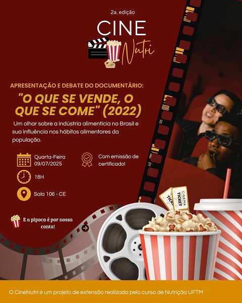 O projeto de extensão CineNutri irá realizar gratuitamente a apresentação e debate do documentário "O que se vende, o que se come" (2022), no dia 9 de julho de 2025, às 18 horas, na sala 106 do Centro Educacional.