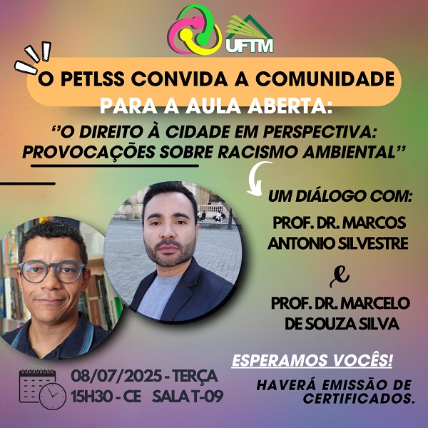 O Programa de Educação Tutorial - Conexões de Saberes, Licenciaturas e Serviço Social (PET LSS) realiza Aula Aberta Formativa intitulada: "O direito à cidade em perspectiva: provocações sobre o racismo ambiental", 15h30, no dia 8 de julho, na sala T-09 do Centro Educacional da UFTM.