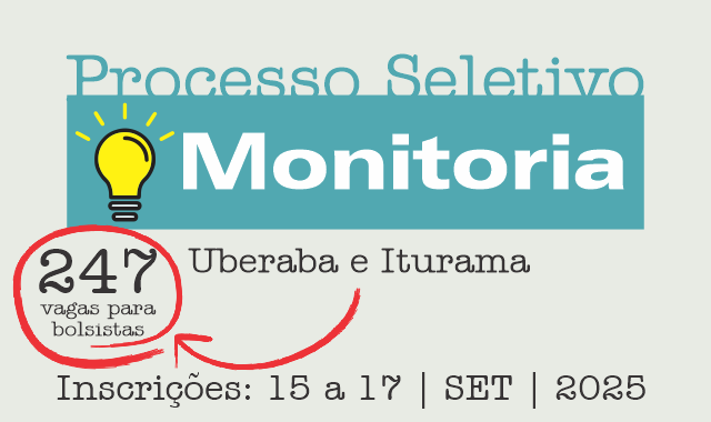 De 15 a 17 de setembro estarão abertas as inscrições do Processo Seletivo para Monitoria dos cursos de Graduação 2025/02 no Campus Uberaba e Iturama. A seleção inclui 247 bolsas de monitoria, além das vagas para monitores voluntários.