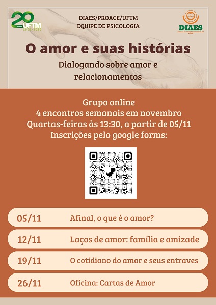 O “Grupo Amor e suas histórias: dialogando sobre amor e relacionamentos”, organizado pela Divisão de Atenção Estudantil em Saúde (DIAES/PROACE), abre inscrições para a comunidade acadêmica da UFTM.