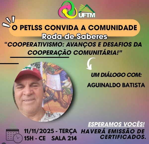 A Roda de Saberes “Cooperativismo: Avanços e Desafios da Cooperação Comunitária!" será realizada no dia 11 de novembro, às 15 horas, na sala 214, no segundo andar do Centro Educacional da UFTM (CE). O evento é presencial e aberto a toda a comunidade acadêmica, sem necessidade de inscrição prévia. Haverá lista de presença no local para posterior emissão de certificados. Aguinaldo Batista, coordenador Estadual do MST, participará da Roda de Conversa, que também é coordenada pelo Programa de Educação Tutorial Conexões de Saberes, Licenciaturas e Serviço Social (PET LSS) e pela Cooperativa dos Recolhedores Autônomos de Resíduos Sólidos e Materiais Recicláveis de Uberaba – COOPERU.