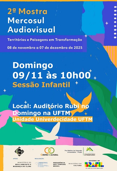 A sessão será realizada no dia 9 de novembro, às 10 horas, no Auditório Rubi, na Unidade Univerdecidade, durante o evento Domingo na UFTM, com entrada gratuita e aberta ao público. Nesta edição, o Cine UFTM exibirá os filmes infantis da 2ª Mostra Mercosul Audiovisual, levando às telas produções que celebram a diversidade cultural do continente e o olhar sensível das novas gerações sobre os territórios e suas histórias.