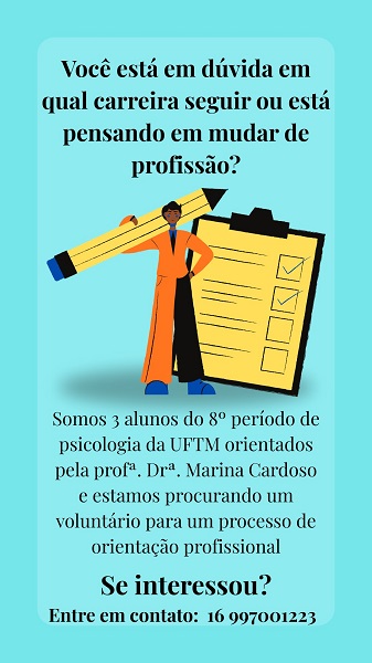 Alunos do 8° período da graduação em Psicologia na UFTM, orientados pela professora Marina Cardoso, procuram um voluntário para uma proposta de orientação profissional que oferece uma oportunidade de expandir perspectivas.