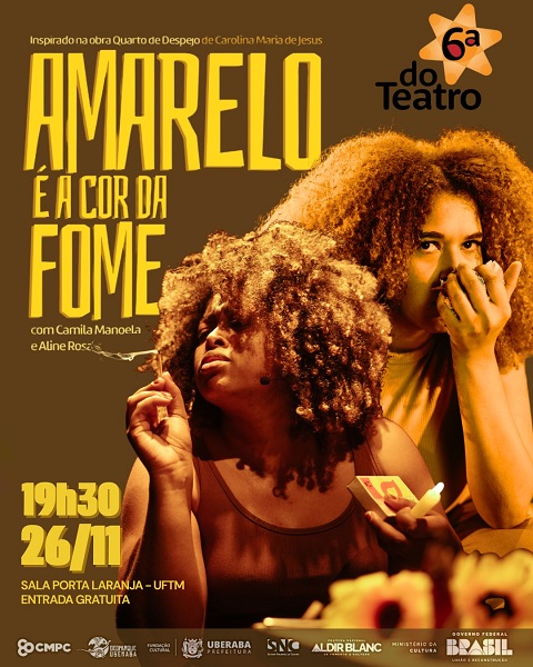 A Universidade Federal do Triângulo Mineiro (UFTM) recebe, no dia 26 de novembro, às 19h30, na Sala Porta Laranja, o espetáculo “Amarelo é a Cor da Fome”, da Cia Cor de Yabá. Inspirado na obra Quarto de despejo: o diário de uma favelada, de Carolina Maria de Jesus, o espetáculo integra a programação do Mês da Consciência Negra. A apresentação é gratuita e aberta ao público em geral, sendo o acesso sujeito à lotação da Sala Porta Laranja.
