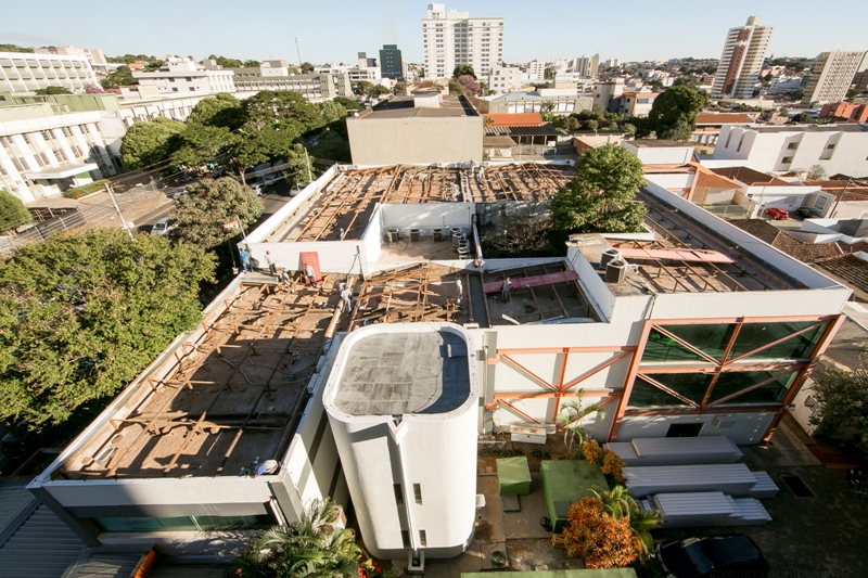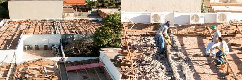 Os serviços compreenderam a retirada total do telhamento e calhas metálicas, refazimento do madeiramento, ampliação e execução de calhas de alvenaria e concreto, que foram impermeabilizados,e a execução de nova cobertura em telhas termoacústica, tipo sanduíche, detalha o engenheiro Gontran Maluf Filho, diretor do Departamento de Engenharia Civil da UFTM. Ainda criou-se áreas de manutenção técnica, sobre a laje impermeabilizada, para alocação dos equipamentos do Sistema de Climatização, bem como para viabilizar melhor acesso e fluxo de profissionais às instalações, troca de peças, recarga de gases, e demais manutenções técnicas necessárias de funcionamento.