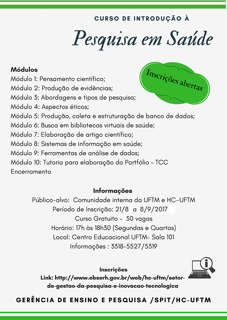 Com o objetivo de fortalecer o cenário da pesquisa e inovação tecnológica a fim de apoiar a assistência e segurança do paciente a Gerência de Ensino do HC-UFTM realizará o curso ‘Introdução à Pesquisa em Saúde’. O curso é gratuito e ofertará 50 vagas destinadas à comunidade interna da UFTM e do HC-UFTM (discentes de graduação e pós-graduação, docentes, pesquisadores e técnico-administrativos). Os interessados em participar devem se inscrever de 21 de agosto até 8 de setembro de 2017 por meio de formulário eletrônico.