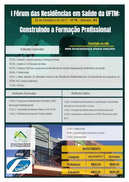 Com o objetivo de identificar e analisar os aspectos críticos da Residência em Saúde para a formação dos profissionais de acordo com os princípios e diretrizes do Sistema Único de Saúde - SUS que atendam às necessidades socioepidemiológicas da população brasileira, o Programa de Residência Integrada Multiprofissional em Saúde – RIMS e a Residência em Enfermagem em Urgência/Trauma realizam no dia 26 de setembro de 2017 o ‘I Fórum das Residências em Saúde da UFTM: Construindo a Formação Profissional’.